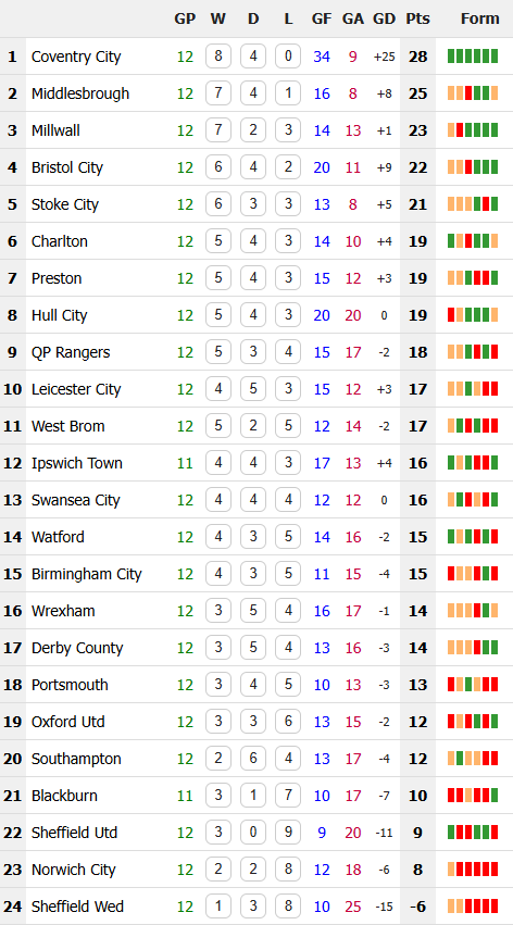โคเวนทรี่ ของกุนซือ แฟร้งค์ แลมพาร์ด ไม่มีรายงานตัวเจ็บหรือติดโทษแบนเข้ามาเพิ่มเติม โจเอล ลาติบิวดิเอเร่ (-) กับ โอลิเวอร์ โดวิน (-) สองแข้งเดี้ยงหน้าเดิม ซึ่งอยู่ในระหว่างพักฟื้นฟูสภาพร่างกายยกเข่ง คาดว่า แลมพาร์ด เตรียมจัดทัพในระบบ 4-2-3-1 โดยมี ฮาจิ ไรจ์ท (11 นัด/8 ประตู) ออกสตาร์ทยืนหน้าล่าตาข่ายและใช้ แบรนด้อน โธมัส-อาซานเต้ (12 นัด/9 ประตู) รับจ๊อบเพลย์เมคเกอร์คอยสนับสนุนอยู่ด้านหลังตามสูตร
