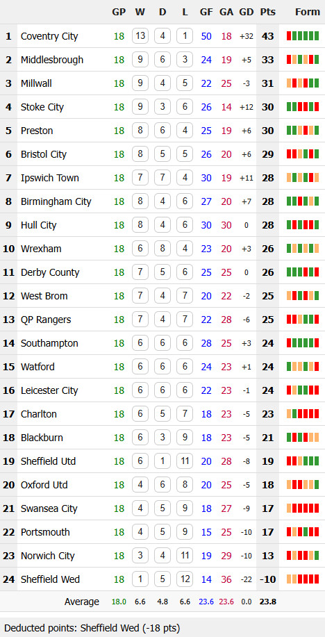 26/11/25 แพ้ โคเวนทรี่ 2-4 (เหย้า) แชมเปี้ยนชิพ / เสมอ ... เสีย